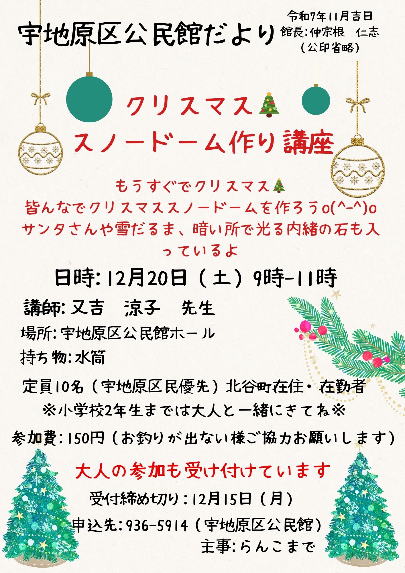 宇地原区公民館クリスマススノードーム講座のお知らせです。サンタさんやトナカイで暗い場所でキラキラ光ります。子供も大人もお気軽にお電話ください。